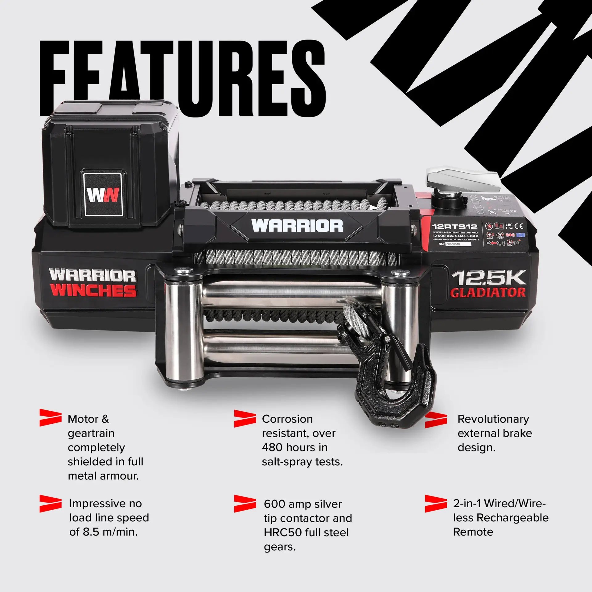 Warriori Gladiator vintsid jätkavad vintsimise ümbermääratlemist võrratu vastupidavuse, jõudluse ja stiiliga. Sisseehitatud 2-in-1 juhtmega/juhtmevaba laetav puldisüsteem muudab vintsimise lihtsaks kuni 15 meetri kauguselt. Termiline ülekoormuskaitse tagab, et ei pea muretsema ülekuumenemise ja kahjustuste pärast äärmuslikes tingimustes ja pikkade, raskete tõmmete ajal.
